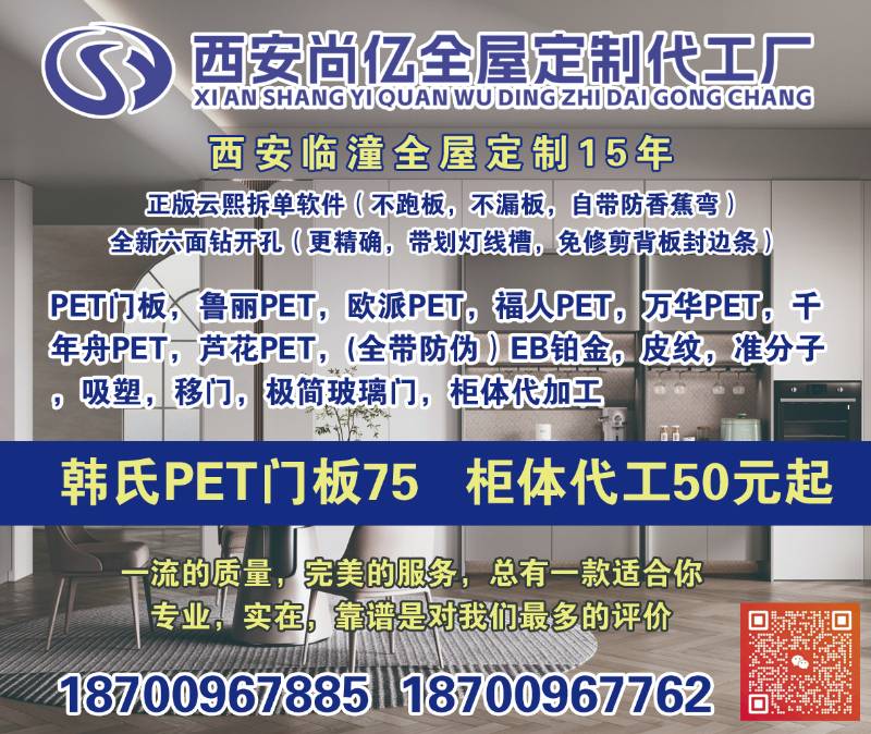 主营:PET门板,鲁丽PET,欧派PET,福人PET,万华PET,千 年舟PET,芦花PET,(全带防伪)EB铂金,皮纹,准分子 ,吸塑,移门,极简玻璃门,柜体代加工